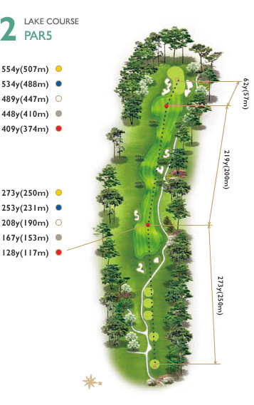 짧은 파5홀 이지만 그린 앞 좌우 벙커 그린도 포대 그린이므로 숏 아이언의 거리에 보낸 다음 3온 하는 것이 좋다.