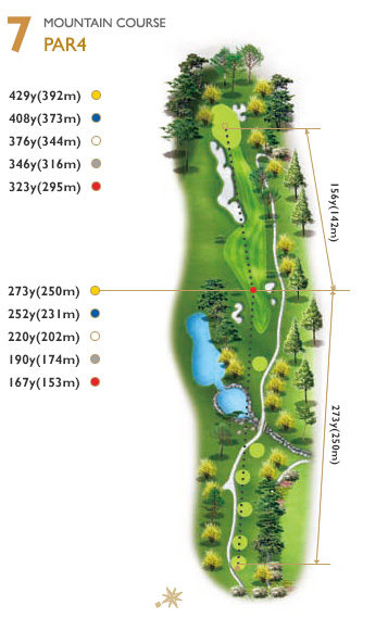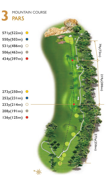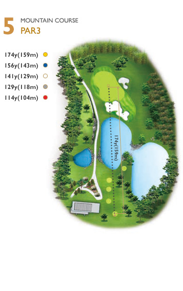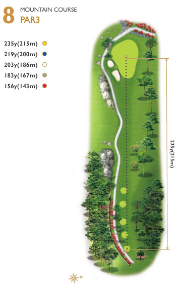 파3중 가장 긴 홀로써 티잉 그라운드 우측에서 그린 뒤쪽의 큰 소나무를 보고 공략하는 것이 좋다. 그린 앞의 좌측이 좁기 때문에 유의해야 하며, 욕심 보다는 2온 한다는 마음으로 공략하는 것이 좋다. 좌측 벙커 초입 200y.
