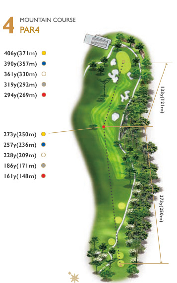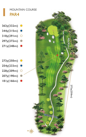 티잉 그라운드 좌측에서 우측 소나무의 좌측 끝으로 공략 하는 것이 좋다. 페어웨이가 우측에서 좌측으로 흐르며 그린을 공략하기도 쉽기 때문이다.