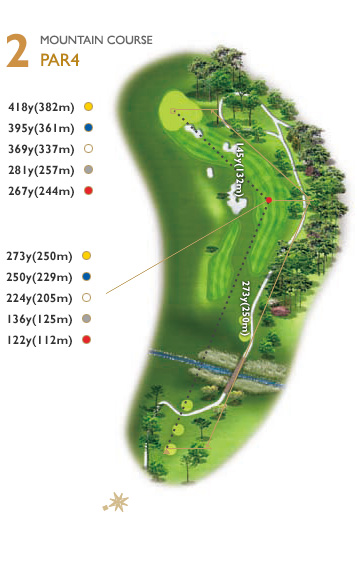 티잉 그라운드 좌측에서 클럽하우스 좌측 끝으로 공략 하는 것이 좋다. 티샷이 260y 이상 나가면 우측은 내리막 스탠스이며 좌측은 해저드가 있어 좋지 않다.